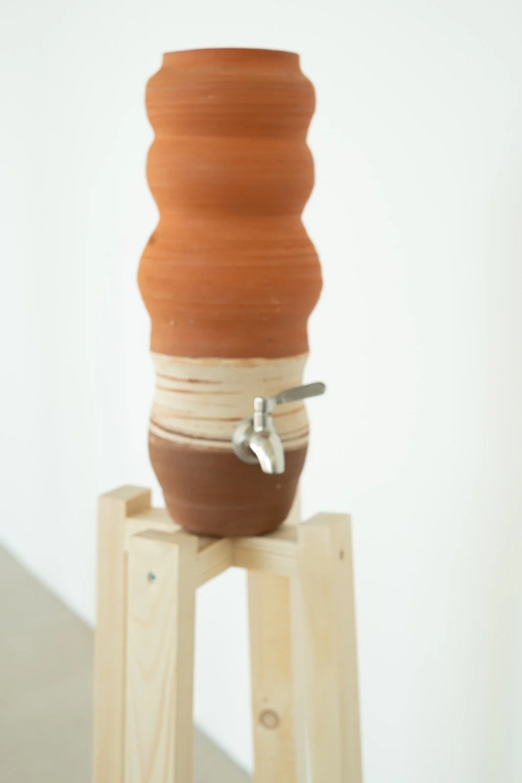 A unique self-cooling water jug crafted from three different clays, bringing together my Brazilian and Dutch heritage in its design. Its natural blend of textures and tones creates a beautifully organic appearance. Functional yet stylish: it safely holds water for everyday use, while the clay keeps it naturally cool, adding both cultural depth and elegant simplicity to any interior.